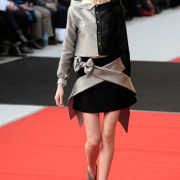 Contraste du maquillage, avec un teint plutôt nude et des yeux quasiment pas maquillés, mais réhaussés par une bouche violine. Contraste d’une chevelure sauvage et mystérieuse, qui ose le rose et contraste avec une allure chic et sobre, où dentelles et paillettes réussissent un mariage déconcertant…